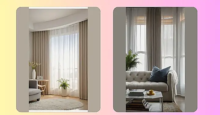 The image shows a living room with beautiful curtains, and it’s like looking into a magazine. The curtains are soft and flowy, and they let in just the right amount of light. It makes you want to curl up on the comfy-looking sofa with a good book and a cup of tea.