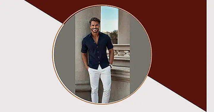 Check out this dude! He’s rocking a look that’s totally vintage cool. It’s like James Dean decided to chill with Don Draper. The light blue button-down and white pants? Classic combo! You could wear this to a fancy party or just to look super stylish while grabbing pizza. Just try not to spill anything on those white pants!