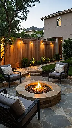 And check out those chairs! Nobody wants to stand around holding their plate awkwardly while trying to look cool, right? This sweet layout includes actual spots to sit back, relax, and judge who tells the funniest (or worst) joke by the firelight. Plus, the way everything is placed, from the cozy seating area to the path leading up, means you’re not just wandering lost in the dark trying to find a place to perch; you know exactly where the snack zone is. It’s proof that thinking about where stuff goes can turn a regular yard into the ultimate hang spot, lit up just right for peak vibe points.