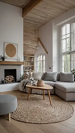 Speaking of perfect, that round rug is totally on point! It’s like a giant, comfy hug for your feet. It’s the kind of rug that makes you want to walk around barefoot all day. And let’s be honest, the fireplace is totally calling your name. Imagine yourself in the winter, snuggled up on the couch, with the fire crackling and the soft glow of the sunlight coming in. You’d be basically living in a Scandinavian dreamland.