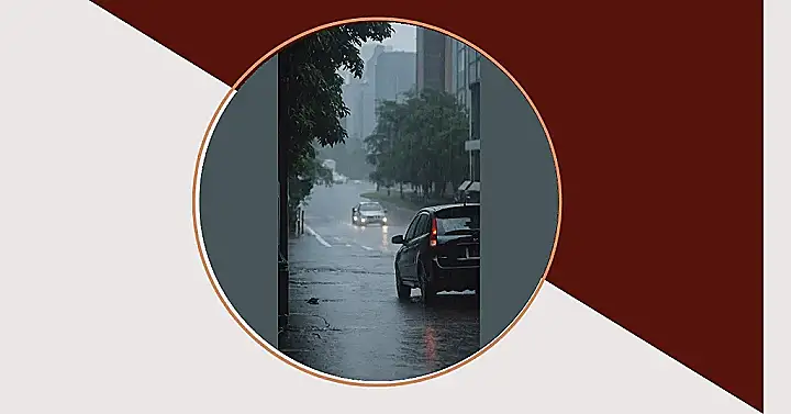This picture is like a rain day wallpaper come to life! Imagine you’re sitting in that car, watching the rain pour down, blurring the city into a cool, gray watercolor painting. The street is gleaming like a giant, wet mirror, and even the cars seem to be slowing down, whispering, “Let’s just enjoy the cozy rain.” It’s the perfect scene for hot chocolate and a good book—or maybe just a really good nap.