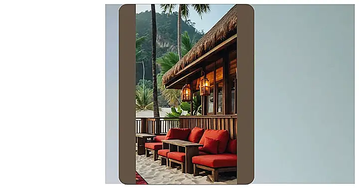 Imagine waking up to the sound of crashing waves and the sweet smell of coconut. You step out of your beach cabana and find yourself in a cozy lounge space, perfect for soaking up the sun and enjoying a good book. The comfy red cushions invite you to relax, and the rustic wooden furniture adds a touch of tropical charm.