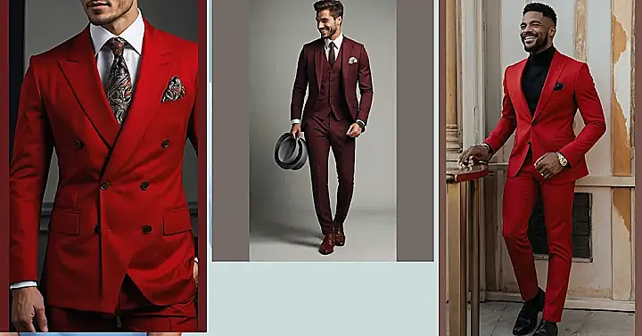 This guy’s rocking a seriously snazzy men’s red suit! It’s like a superhero costume, but instead of fighting crime, he’s probably just conquering the world of amazing style. That shade of red is bold, it’s confident, and let’s be honest, it’s way more fun than your average boring grey suit. He looks like he’s ready for a fancy party, a red-carpet event, or maybe even a very stylish game of hide-and-seek (because who wouldn’t notice him in that suit?).