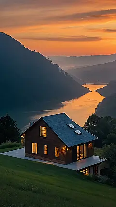 Imagine snuggling up inside with a hot chocolate, watching the sun dip below the hills, painting the sky in fiery oranges and soft pinks. That’s the kind of peaceful evening you could have in this amazing house! It’s like something out of a fairytale, perched perfectly on a hillside overlooking a glistening river. Seriously, who needs a TV when you’ve got a view like that? The house itself looks super cozy, all dark wood and warm lights, just begging you to curl up with a good book (or maybe just stare out the window at the breathtaking scenery).