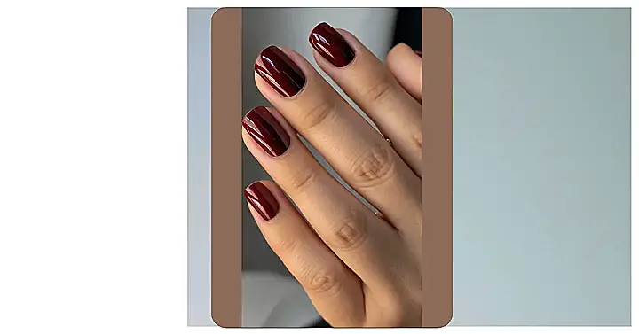 These nails are seriously giving me fall vibes! That deep burgundy color is like the perfect shade for sipping hot cocoa by a fireplace (even if it’s 70 degrees outside). They’re so shiny and sleek, it almost looks like they could be mistaken for expensive wine glasses! I bet they’d look amazing with a cozy sweater and a good book.