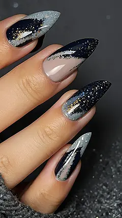 These nails are seriously out of this world! Imagine a frosty night sky, all sparkly and shimmering, captured on your fingertips. That’s basically what these awesome winter nails are – a mix of dark blues, sparkly glitters, and a touch of creamy beige that looks like fresh snow. They’re so cool, you’ll want to show them off all winter long (even if it’s just to your cat!).