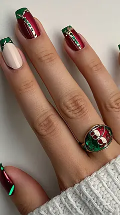 **Paragraph 1:** OMG, check out these Christmas nails! They’re like tiny, adorable presents on your fingertips. That deep red and sparkly green combo is totally festive, and those little gold accents are so chic. It’s like someone took Christmas wrapping paper and shrunk it down to nail size! I bet this manicure would make even the Grinch grin (maybe just a little). They’re perfect for all those December holiday parties and cozy nights in.