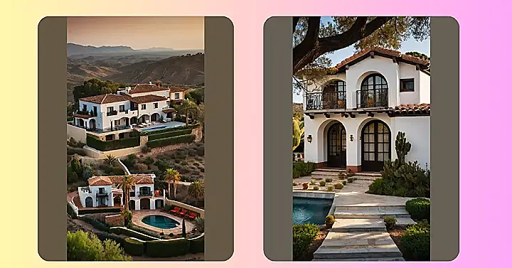 This Spanish-style house is like a chill hangout spot straight out of a movie! With its cool terracotta roof tiles and those chill vibes, you can almost hear the sound of acoustic guitar music wafting out. It totally looks like the kind of place where you could kick back with some friends, maybe learn a few Spanish phrases, and definitely enjoy some amazing sunsets.
