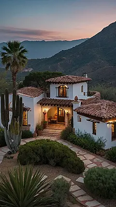 This adorable little Spanish-style home is like something out of a fairytale! Imagine yourself sipping lemonade on that cute balcony, maybe with a fluffy white cat curled up beside you. It’s got all the classic features: the warm terracotta roof tiles, the charming arched doorway, and that beautiful whitewashed exterior that practically glows in the evening light. It’s the perfect size for cozy family gatherings or a quiet getaway, especially if you appreciate a little bit of “olé!” in your life.