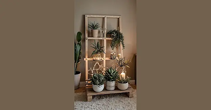 This DIY home decor setup is like a jungle gym for your plants – they’re probably plotting to climb to the top. It’s all about those simple touches, like wrapping some string lights around a branch you found in the backyard. Seriously, who needs expensive art when you have glowing twigs and happy succulents? Give it a try; you might just surprise yourself with how crafty you can be and how jealous your friends will get!