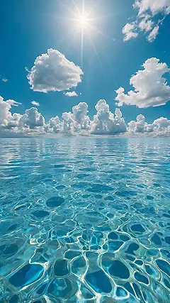 Feeling like you need a mini-vacation right on your computer or phone screen? This image is basically a chill pill for your eyeballs! Look at that water, so sparkling and blue it almost convinces you you should be floating in it right now instead of, you know, doing whatever you’re actually doing. Those puffy clouds up there look like they were drawn by a cartoonist, and the sun is just showing off how bright and happy it can be. Using this as your water wallpaper is like giving your screen a personal spa day, making everything look a little less stressful and a lot more like paradise.