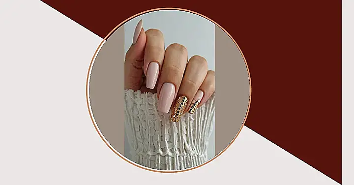 So, you wanna be the queen of spring with your nails? These colors are like a breath of fresh air, ditching the gloomy winter vibes. The picture shows a classy, nude-ish pink that’s perfect for, like, everything. But then BAM! One nail is screaming ‘I’m fancy!’ with gold, glitter, and little gems. It’s like the perfect combo of chill and “I’m about to hit up the coolest party ever.”