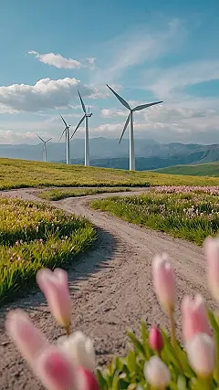 Those windmills in the background are like giant, futuristic pinwheels celebrating spring, aren’t they? They’re basically saying, “Winter’s over, let’s make some clean energy and enjoy the sunshine!” Imagine biking down that road, flowers tickling your ankles, and feeling the wind power those blades.