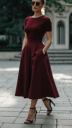 This girl’s got the perfect casual classy look! Think comfy, but stylish – like being able to rock a super important meeting, but still look cute and feel amazing. That burgundy dress is a total winner – it’s simple, but the cut makes it look extra fancy. You can totally tell she’s confident too, because of her shoes! Those heels are seriously cool, and they go with everything. It’s like she’s saying, “I’m here to slay, but I’m also chill.”
