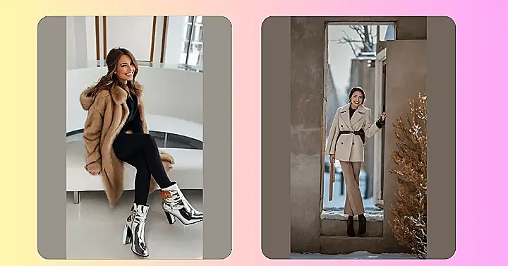 This image is the definition of cozy winter style! The fluffy brown coat looks super soft and warm, like a giant teddy bear hug. Imagine how comfy it would be to snuggle up in that coat on a snowy day. She’s rocking a totally cool look with the black leggings and shiny silver boots. Those boots are like a futuristic touch that makes this outfit super stylish and unique. This girl is ready for anything, whether it’s braving the cold or looking fabulous at a winter party!