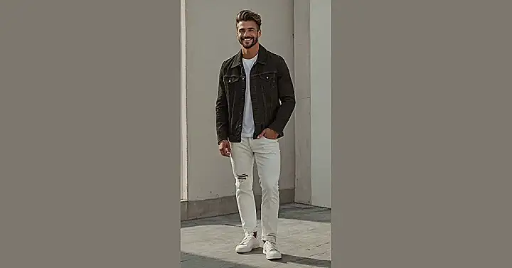 Hey there, fashion-forward friend! Check out this awesome men’s jeans outfit. It’s the perfect blend of cool and comfy. We’ve got sleek black jeans, which are totally versatile – you can dress them up or down. Then, we’ve layered on a super soft white hoodie for that effortlessly stylish vibe. But the real star of the show is that bad-to-the-bone black leather jacket! It adds a bit of edge, like you’re ready to ride off into the sunset on your motorcycle (even if it’s just to the corner store for snacks). This whole outfit screams “I know what I’m doing,” even if you just threw it together in five minutes – which is totally fine; we won’t judge.