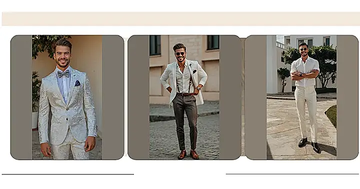Picking out a cool summer wedding outfit for guys can feel like a mission impossible sometimes. You want to look sharp like the dude in the picture, all smiles and fancy suit, but the thought of standing around in the blazing sun feeling like a penguin wearing a sweater is just… ugh. Light-colored suits like this cream one are your secret weapon! They don’t soak up all that heat like dark ones do, so you might actually make it through the ceremony without turning into a human puddle. Plus, they just scream “summer celebration,” not “about to faint in a sauna.”