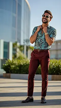 This guy’s totally rocking the “mens Bold Print Shirt outfit” thing! Check out that awesome teal shirt – it’s like a tropical vacation exploded onto fabric. He’s paired it perfectly with those rich burgundy pants, proving that sometimes opposites really *do* attract. The whole look is effortlessly cool, like he just stepped out of a fashion magazine – and maybe grabbed a quick iced coffee before the shoot.