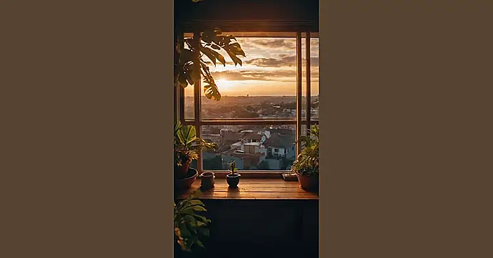 This picture is like a real-life anime wallpaper! Imagine a character from your favorite show, maybe a shy magical girl or a brooding samurai, gazing out this window at the gorgeous sunset. The warm glow on the plants and the city below is totally Instagrammable, and it’s just the kind of peaceful scene you’d find in a relaxing anime moment before a big battle or a heartfelt confession. Those little potted plants are totally rocking the cozy vibe too, they’re like miniature anime characters themselves!