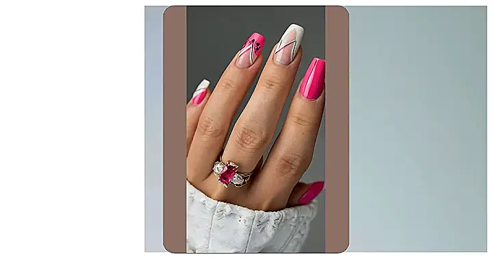 So, these nails are seriously next-level! Forget boring single colors; this is like art class for your fingertips. We’ve got some bold pink going on, mixed with some fancy white designs that look like they were drawn with a super-steady hand. It’s like a modern twist on a French manicure, but way more fun!