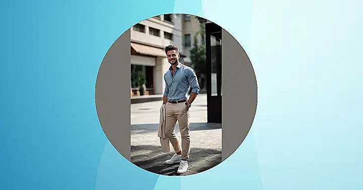 So, you want to look like you just stepped out of a magazine but without looking like you tried too hard? This outfit is your answer! It’s like the perfect combo of “I own a yacht” and “I can still throw a frisbee in the park.” The light blue shirt is chill but classy, the khakis are like comfy but make you look put-together and the white sneakers is a great choice of not looking too fancy or stuffy. Plus, rolling up the sleeves is basically a secret signal that you’re ready for anything, from a spontaneous pizza run to saving the world.