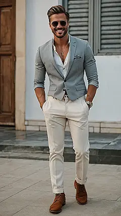 Forget the stuffy tux – check out this awesome wedding look! This guy’s rocking a light grey blazer with crisp cream pants. It’s totally stylish but still comfortable enough to dance the night away (or maybe just impress your crush). Think of it as smart casual, meaning you look sharp but you won’t feel like you’re wearing a suit of armour. Plus, those brown shoes? They add a touch of relaxed cool, so you don’t look like you’re headed to a job interview.