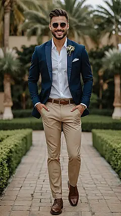 Going to a summer wedding can feel like showing up to a fancy party… in a sauna. You want to look sharp enough for photos but not feel like you’re melting into a puddle. That’s where outfits like the one in the picture come in. Think light colors that don’t absorb all the sun’s rays and breathable fabrics so you’re not sweating through your shirt before the “I do’s.” It’s all about staying cool while looking hot (in a good way!), proving you can handle the heat and still nail the ‘dressed up’ vibe. Plus, you won’t spend the entire reception fanning yourself with the program.