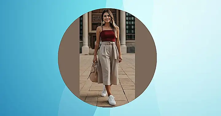 So, you wanna look amazing without trying too hard this summer? Check out this outfit! It’s like, business on top with that cute red tank, but party on the bottom with those comfy, flowy pants. Who says you can’t rock comfy pants and still look super put-together? Plus, she’s rocking those sneakers! Talk about comfy chic!