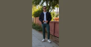 Looking good without feeling stuffy? That’s the magic of smart casual outfits for guys, just like the one in the picture. This dude’s got a green jacket that says ‘Yeah, I cleaned up a bit, but I’m still cool enough to hang.’ Pair that with the black sweater and pants, and suddenly you look ready for anything from a slightly fancy party to just flexing on your friends (in a good way!). It’s all about hitting that sweet spot between ‘just rolled out of bed’ and ‘interviewing for a boring job,’ making you look effortlessly put-together for occasions when sweatpants just aren’t the answer.