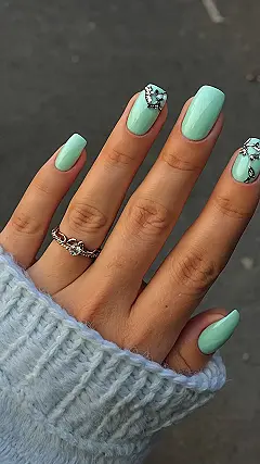 These nails are definitely mint to be! The soft green color is so refreshing, and the little sparkly gems on a couple of the nails really make them pop. It’s like having a little piece of spring on your fingertips! Maybe you should try this nail color, especially if you’re feeling a bit blue, it’s sure to brighten up your day.