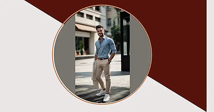 So, you want to look like you just stepped out of a magazine but without looking like you tried too hard? This outfit is your answer! It’s like the perfect combo of “I own a yacht” and “I can still throw a frisbee in the park.” The light blue shirt is chill but classy, the khakis are like comfy but make you look put-together and the white sneakers is a great choice of not looking too fancy or stuffy. Plus, rolling up the sleeves is basically a secret signal that you’re ready for anything, from a spontaneous pizza run to saving the world.