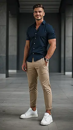 So, you want to look like you just stepped out of a magazine but without looking like you tried too hard? This outfit is your answer! It’s like the perfect combo of “I own a yacht” and “I can still throw a frisbee in the park.” The light blue shirt is chill but classy, the khakis are like comfy but make you look put-together and the white sneakers is a great choice of not looking too fancy or stuffy. Plus, rolling up the sleeves is basically a secret signal that you’re ready for anything, from a spontaneous pizza run to saving the world.