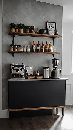 And check out those shelves! They’ve got rows of fancy bottles and even little plants trying to look all professional. This is basically what my pantry dreams of being, but with less questionable leftovers and more cool jars. Think of all the snacks you could stash up there, perfectly organized next to your syrups! Having a coffee bar like this means your friends will actually want to hang out at your place, even if you only know how to make instant coffee (shhh, it’s about the vibe). This image is full of sneaky good coffee bar ideas, like making sure you have comfy stools so people don’t run away after two sips.