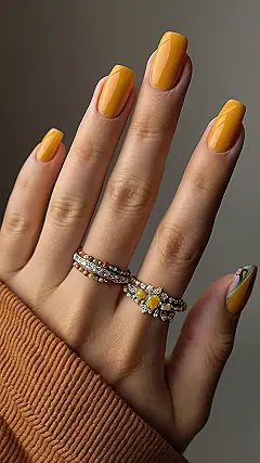 These nails are totally giving us autumn vibes! The bright, sunshine yellow is like a warm hug on a chilly day. It reminds us of falling leaves and pumpkin spice lattes, but with a touch of modern flair. Who knew that something so simple could be so trendy?