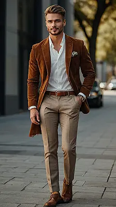 Looking sharp doesn’t mean you have to wear a suit of armor made of boring gray fabric! Check out this guy rocking some serious style. He’s got that “just stepped out of a fashion magazine” vibe with his brown jacket and perfectly fitted pants. It’s like he raided a super-cool grandpa’s closet and made it his own.