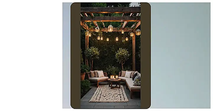 Look up and see those hanging lights – they aren’t just lights, they’re atmosphere generators! They make the whole scene glow like a fancy outdoor cafe, but without the awkward small talk. These cool wicker-style lamps are working overtime to make your patio feel like the coolest spot in the neighborhood, perfect for late-night chats or just enjoying the evening air. It’s funny how a few well-placed pieces of outdoor decor, like these awesome lights, can totally transform a space from ‘meh’ to ‘wow, gotta hang out here ASAP’.