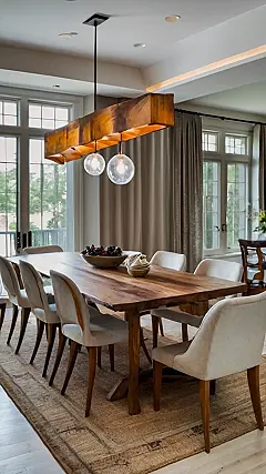 That dining room table looks like it’s ready for a feast, or at least a killer board game night. The light fixture hanging over it is super cool; it’s like a fancy piece of wood decided to hang out with some giant lightbulbs. It really ties the room together, kinda like the Dude’s rug from The Big Lebowski, but hopefully less likely to be peed on.