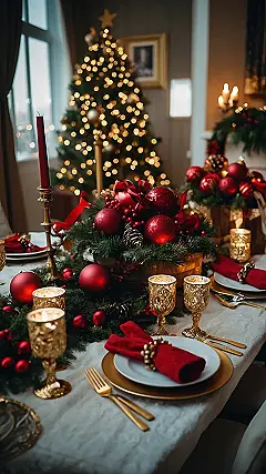 Imagine this: it’s Christmas Eve, and you’re not just having dinner – you’re having a *Christmas extravaganza*! The table’s decked out like something from a movie, all shimmering candles and fancy glasses. Those aren’t your grandma’s wine glasses; these are seriously sparkly, like tiny crystal castles holding golden liquid. Even the Christmas ornaments look like they’re ready for a red-carpet event! It’s the epitome of luxury Christmas decor – so fancy, you might need to wear a tuxedo just to sit down.