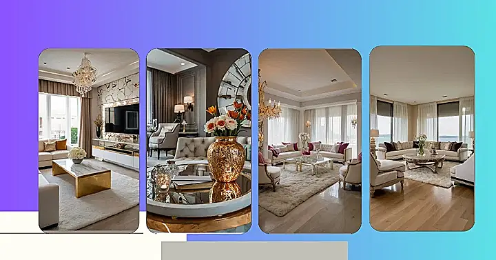 This living room isn’t just fancy; it’s like stepping into a sparkly, grown-up fairytale. Imagine sinking into those unbelievably plush sofas after a long day, maybe with a giant mug of hot cocoa. The chandelier is absolutely dazzling ‚Äì it practically screams “lavish home decor,” doesn’t it? And those gold wall pieces? They look like some super-cool, artistic puzzle pieces. You could totally get lost in this room just admiring the details!