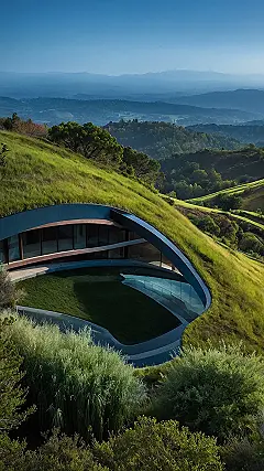 This house isn’t just a house, it’s like a giant, curvy hug from the Earth itself! The “organic architecture” style means the building flows and bends like a river, with smooth curves and windows that look like giant eyeballs peeking out at the world. It’s like something out of a sci-fi movie, but instead of spaceships, it’s just a super cool place to chill out and maybe take a dip in that fancy-looking pool!