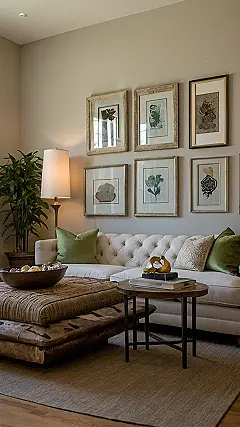 This room is like a super chill art museum, but way more comfy. Imagine having a sleepover here! You could pile up all those awesome throw pillows, snack on popcorn, and binge-watch your favorite shows on the softest couch ever. Plus, those flower pictures on the wall are totally Instagram-worthy.