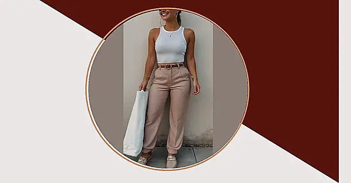 This outfit is like the perfect blend of comfy and chic! You can wear these trousers to your friend’s party or even to a job interview. They’re like those jeans you love but way fancier – imagine if jeans and dress pants had a baby, this is what it would look like! The white tank top adds a little something extra, like you’re ready to conquer the world (or at least the lunch break buffet).