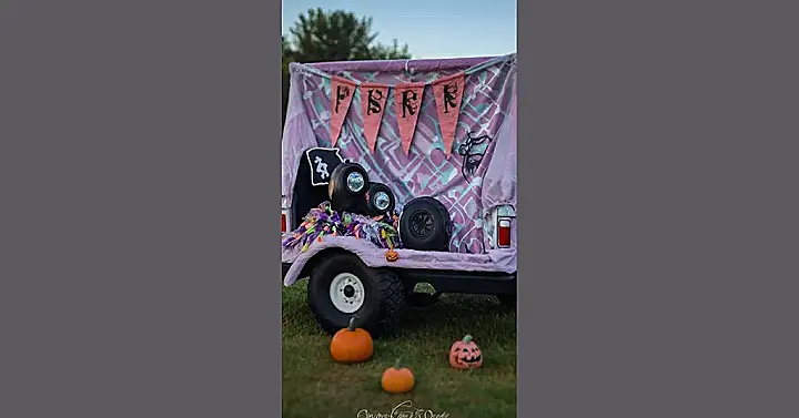 This truck bed is decked out for a spooky good time! Look at all those pumpkins! It’s like a pumpkin party in the back of this truck. And those blue and pink covers? They’re like a giant blanket for all the treats. It’s the perfect place to hand out candy to all the little ghosts and goblins who come trick-or-treating. Plus, it’s so fun to see all the different costumes. You never know what’s going to show up at your trunk!