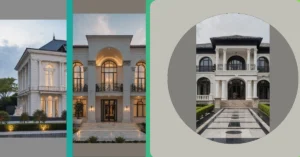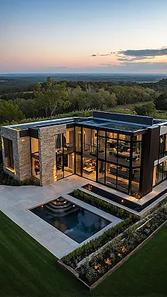 Check out those huge windows that look like giant eyes staring at the sunset! And the way they mix the smooth, cool stone with warm wood accents? That’s the architecture design showing off. It’s got these neat layered levels, like a futuristic cake, and lights that make it glow like a spaceship landing for a party. Imagine the epic games of hide-and-seek you could play here! This kind of design isn’t just about having walls and a roof; it’s about making a big splash and saying “Yep, we live in something awesome.”