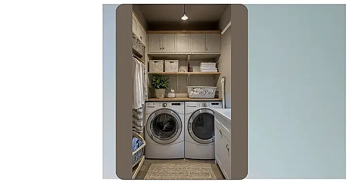Imagine this: you’ve conquered Mount Washmore (aka a mountain of dirty clothes), and now you get to relax and admire your organized laundry oasis. The wicker baskets are perfect for storing those folded treasures, ready to conquer the next wardrobe challenge. Plus, that little framed picture above the machines? It’s probably a motivational quote reminding you that even laundry days can be pretty darn stylish. It’s the ultimate combination of function and fashion – who knew laundry could be so sophisticated?