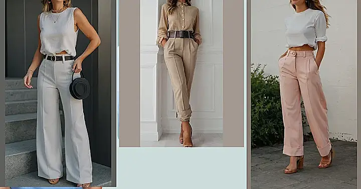 This picture shows a woman rocking a super stylish look with trousers. She’s got that “I’m ready to conquer the world” vibe going on, and her trousers are definitely part of it! It’s all about those wide-legged, comfy trousers that make her look so put together, but without the feeling of being trapped in a pair of skinny jeans. Plus, she’s got a cute shirt and a belt that really brings the whole outfit together.