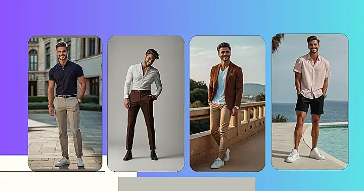 Latest men’s fashion trends can sometimes look complicated, but honestly, a lot of it is about keeping it simple and clean, like the guy in the picture. He’s just rocking a cool colored polo shirt, some nice fitting tan pants, and clean white sneakers. It’s like the fashion gods said, “You know what? Let’s make looking good easy for a change.” No crazy patterns or layers you can’t figure out; just solid pieces that look sharp and don’t make you feel like you’re wearing a costume.