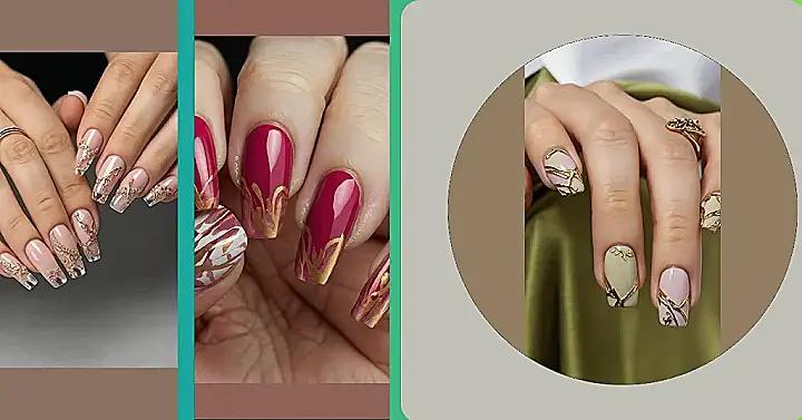 Then you’ve got that one rebel nail with the crazy marble swirls! It’s like a modern art masterpiece happened right there on your finger, mixing white, pink, and gold stripes in a cool, messy-but-stylish way. While some nails are happy being low-key and, well, *nude*, this one is definitely the wild card of the bunch, adding an extra layer of awesome to the whole look. It just proves that even if you’re playing with bolder colors instead of your go-to nude, there’s always room for a little unexpected pattern to spice things up and make your manicure pop!