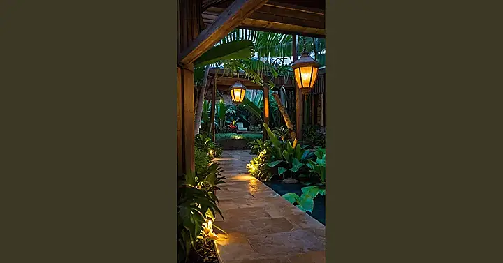 Imagine walking down a pathway, surrounded by lush green foliage and the soft glow of hanging lanterns. It’s like stepping into a tropical dream! This picture shows a perfect example of what a tropical landscape design can look like, with its gorgeous plants, warm lighting, and a hint of a pool in the distance. It’s a place where you could relax and unwind, feeling like you’re on vacation every day.
