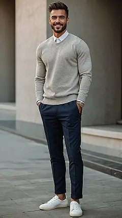 And check out those pants and sneakers! No stuffy trousers and uncomfortable dress shoes here. Those navy pants look comfy enough for a long Netflix binge, and the white sneakers are basically saying, “Yeah, I look good, but I’m also ready to walk wherever the snacks are.” Smart casual for guys is basically finding that sweet spot where you look put-together enough that your grandma would approve, but also chill enough that your friends won’t make fun of you for being overdressed. It’s the ultimate style cheat code.